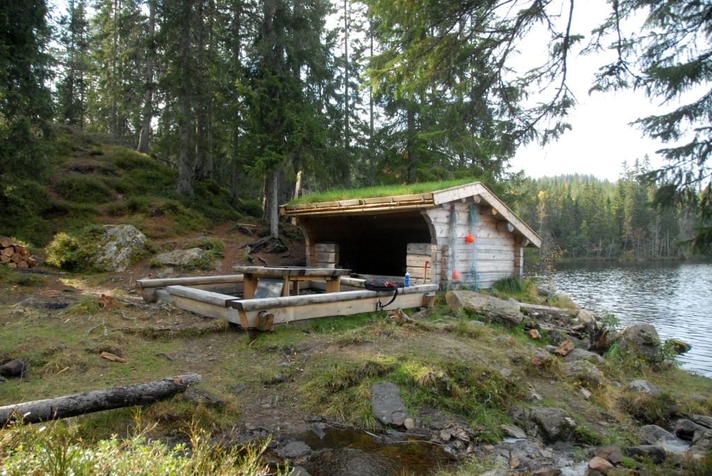 gapahuk inntil Herjuvatnet, en bekk, flytebrygge og spisested