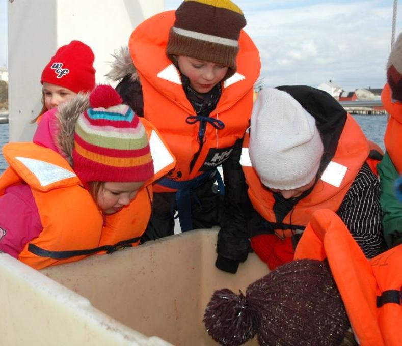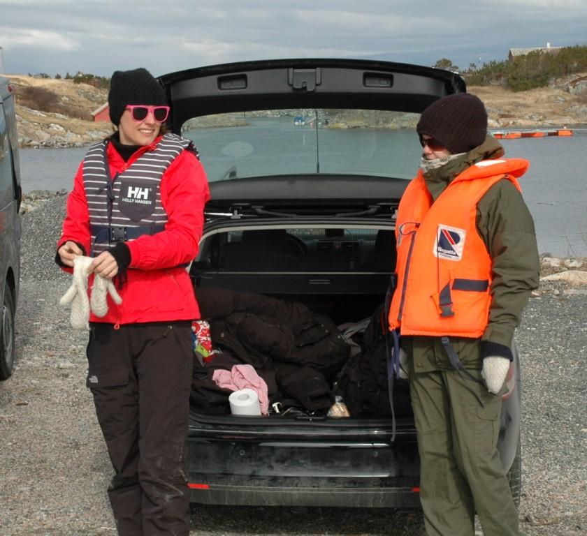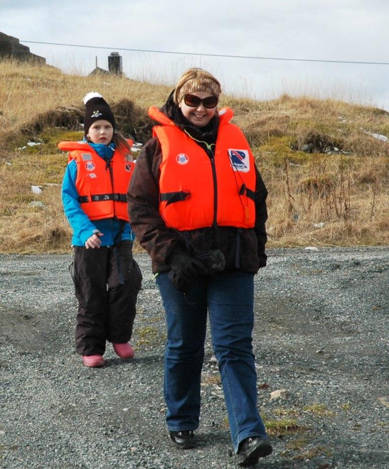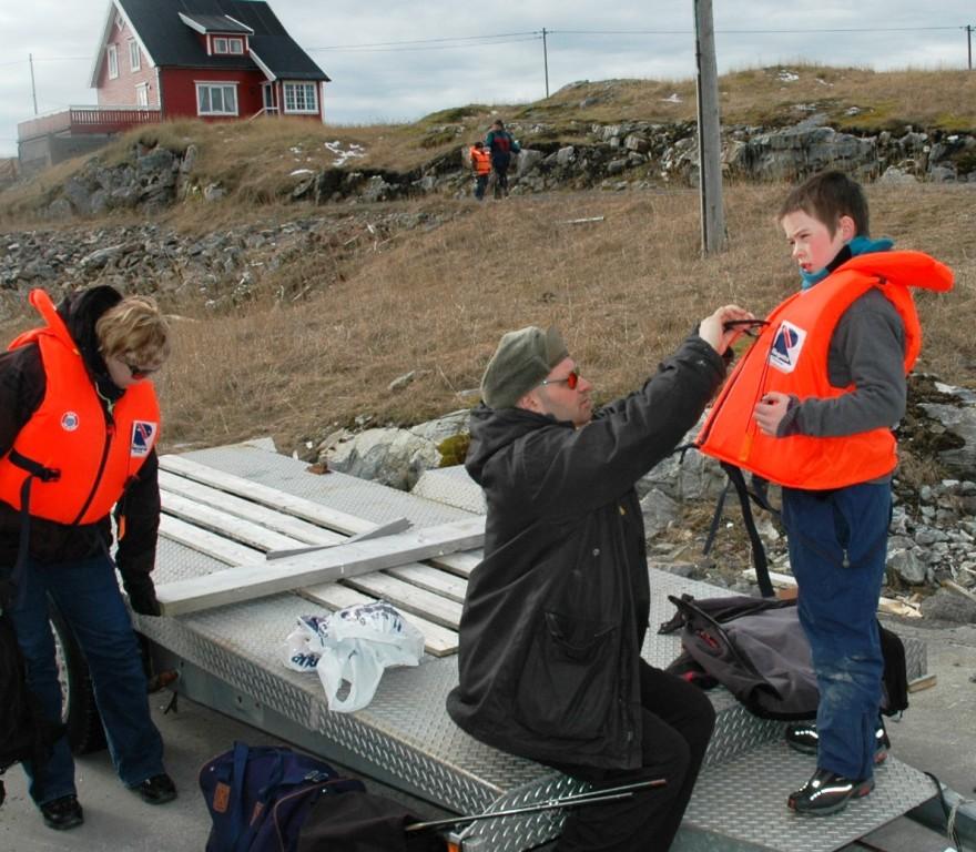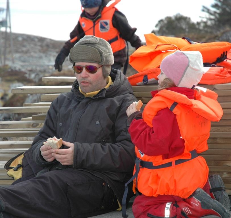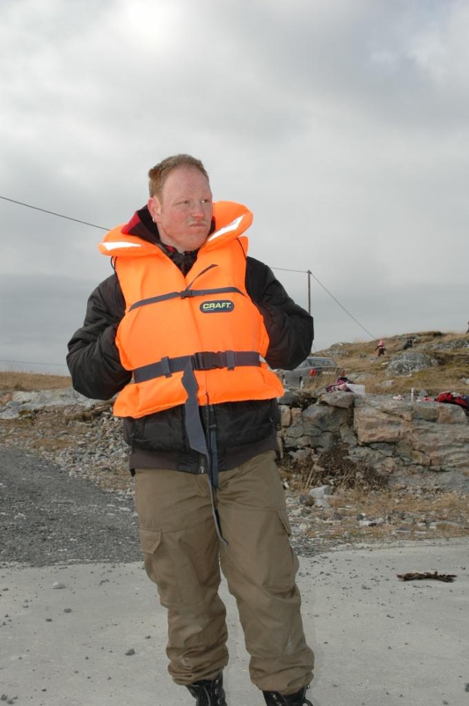 Under: Svein Viggo på vei ut med MS Titran. At alle rundt ham har vest på betyr ikke at han ikke er en flink skipper - det er bare påbudt...